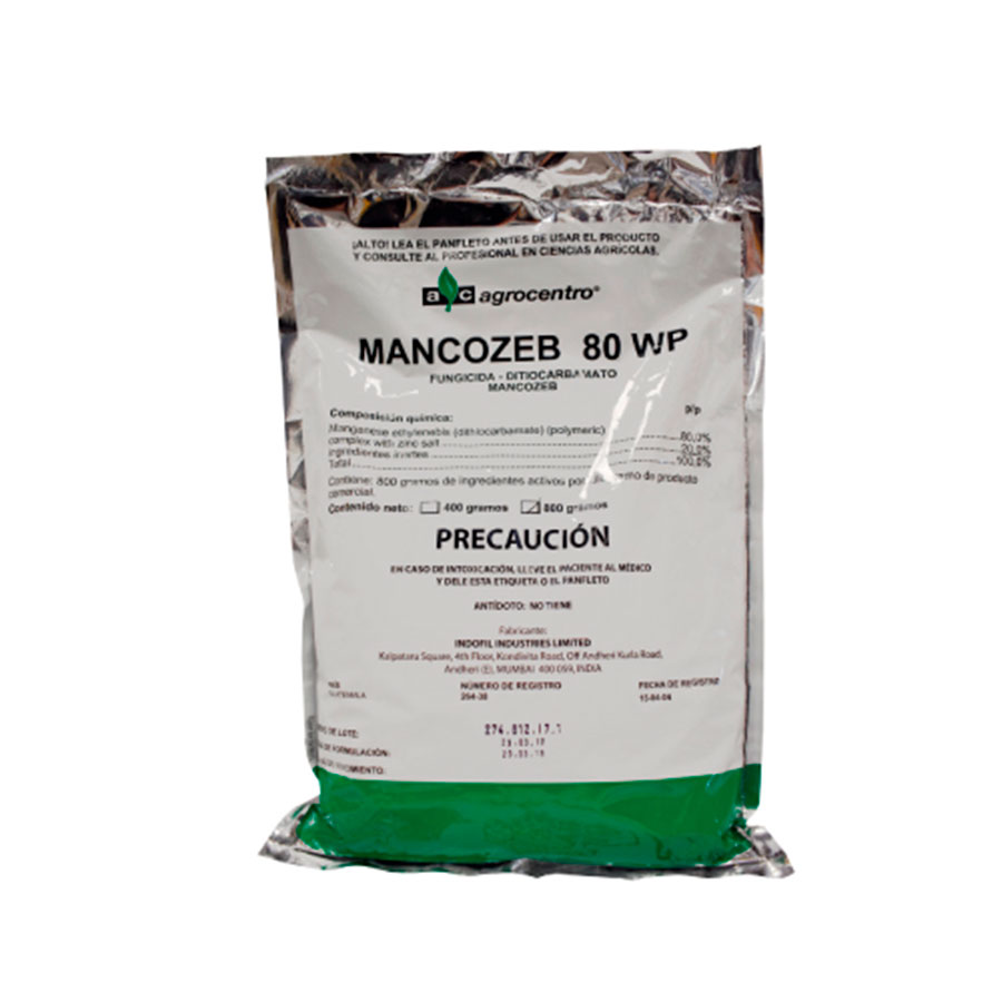 Ingrediente activo: Mancozeb MANCOZEB 80 WP, es un fungicida protectante de amplio espectro, para el control de enfermedades, actúa como Multisitio, formando una capa protectora sobre el follaje, que inhibe la germinación de esporas, deteniendo crecimiento de tubo germinativo y formación de apresorios. Protectante, multisitio, de amplio espectro. Forma una capa protectora sobre el follaje. Inhibe la germinación de las esporas. Detiene el crecimiento del tubo germinativo y la formación de apresorios.